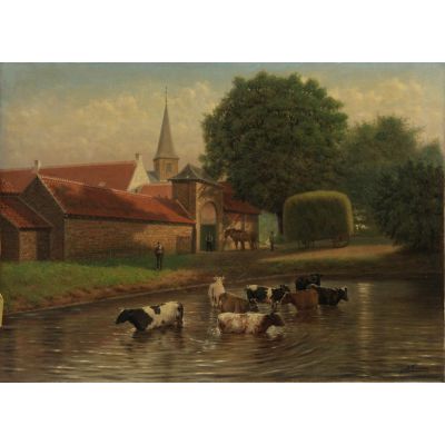 | Herders met koeien in het water en hooiwagen bij dorpsmuur in Italië | |