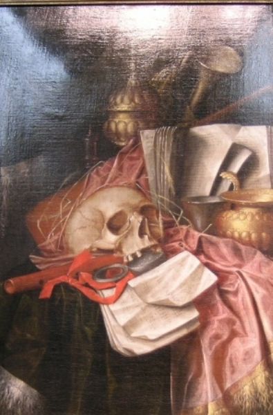 | VANITAS STILL LIFE WITH A SKULL, BOKAAL, POCKET WATCH, MUSIC SCORE AND A FLUTE | |