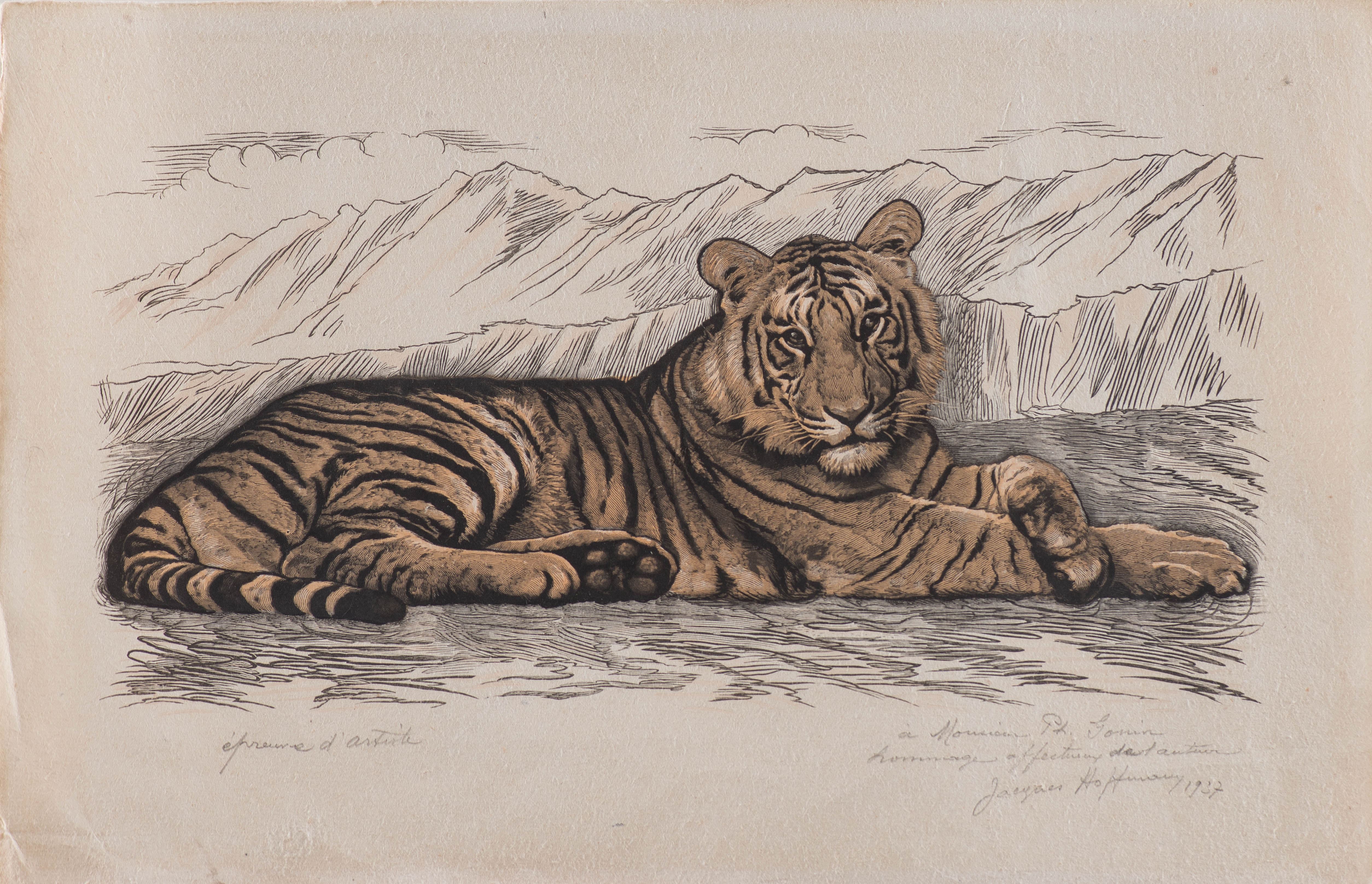 Jacques Hoffmann (active 1930-1940), "Bengal Tiger lying", enhanced xylography, artist's proof, signed and dedicated lower right "to Mr. Ph. Gonin affectionate homage of the author Jacques Hoffmann 1937". | |