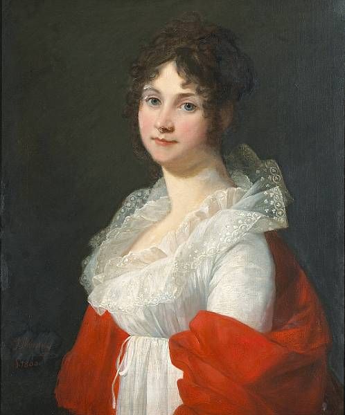 | A portrait of a lady, half-length, in a white dress and red wrap | |