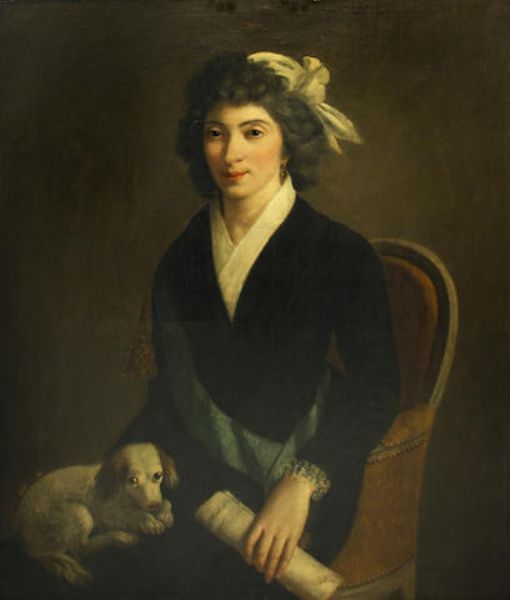 | A portrait of a woman, three-quarter length, seated, with a dog in her lap and holding a sheet of music in her left hand | |