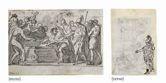 | Alexander ordering the books of Homer to be preserved (recto); Study of a triumphal procession with a subsidiary study of the fi | |