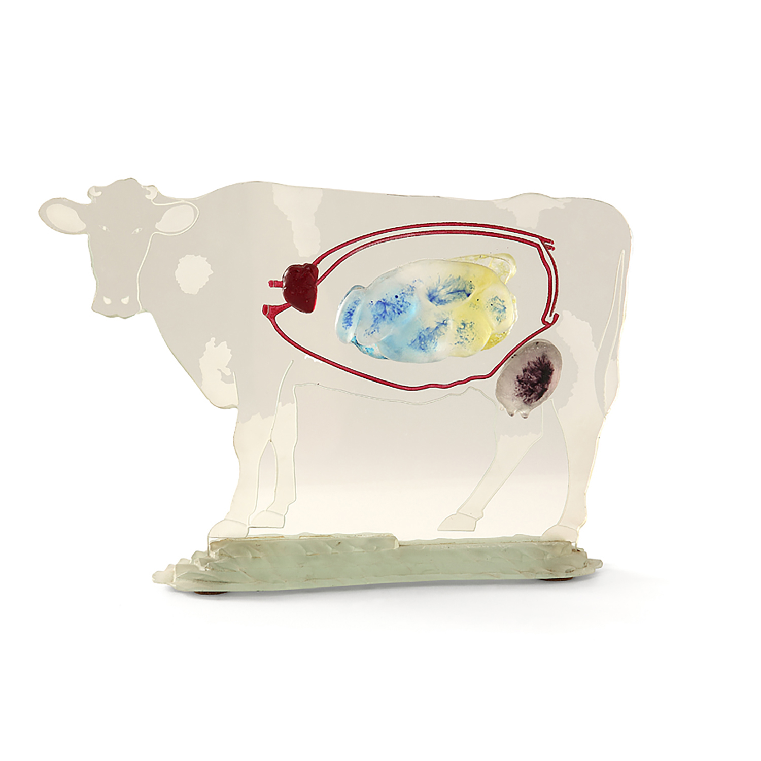 | Sculpture en verre découpé et sablé représentant une vache, organes en résine colorée, terrasse en résine | |