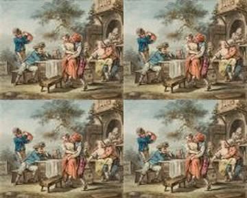 Frivole Tischgesellschaft vor einem Wirtshaus.
