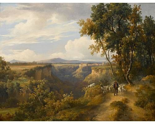 | A goatherder and his flock in an Italianate landscape, possibly Faleria | |