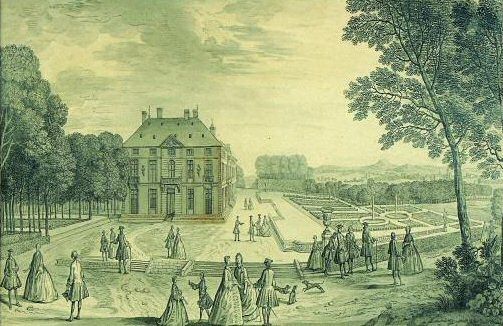 | Promeneurs dans les jardins à la française d'une demeure | |