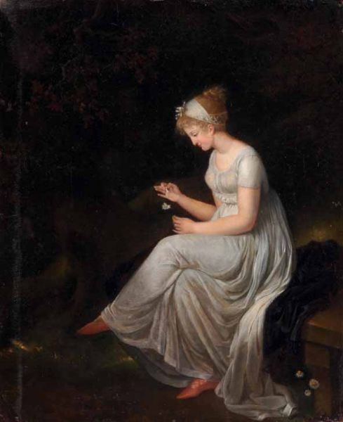 | Junge Dame in Empirekleid, an einer Margueriten-Blüte zupfend | |