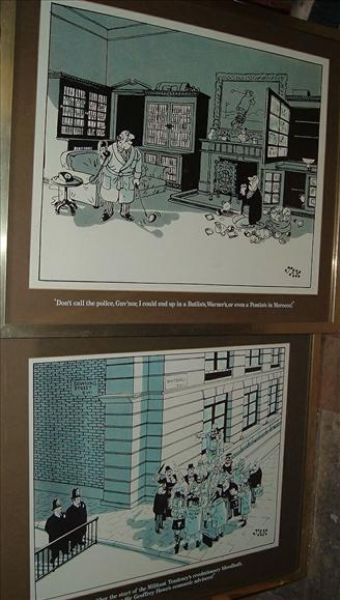 Two cartoons: 'It's either the start of the militant tendency's revoloutionary bloodbath or SIr Geoffrey Howe's economic adviser