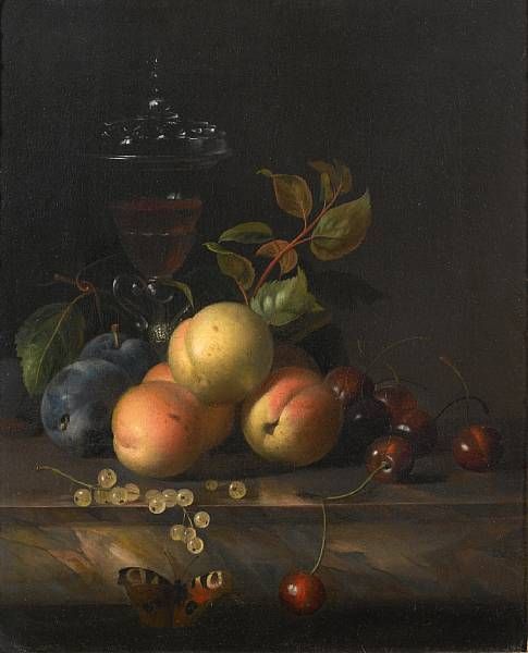 | Cherries, plums and peaches with a façon de venise wine glass on a marble ledge with a red admiral butterfly | |