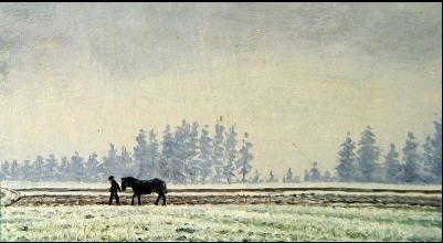 Bauer mit Pferd auf winterlichen Feldern