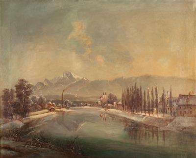 Villach mit der Drau, im Hintergrund der Mittagskogel im Winter