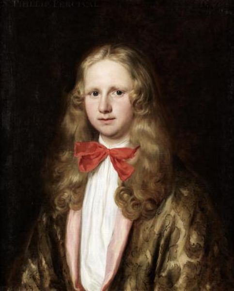 half-length, in a grey brocade coat, a white chemise and a red cravat