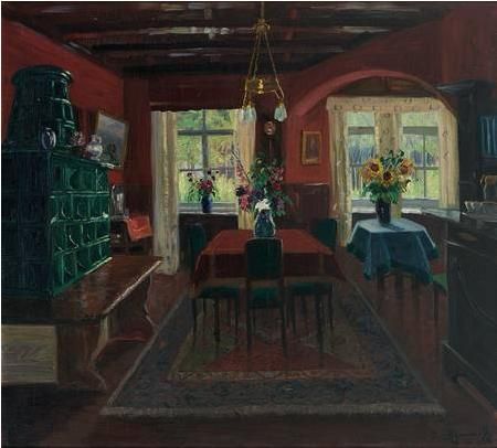 | Blick in eine gute Stube mit grünem Kachelofen vor roter Wand. Durchblick ins Freie. | |