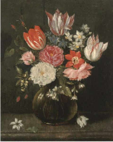 | Parrot tulips, narcissi, roses, anemones and other flowers in a glass vase on a stone ledge | |