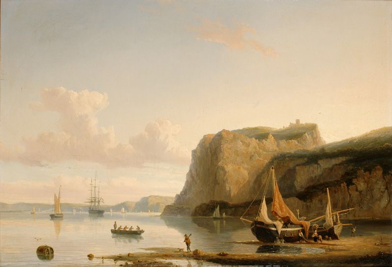 | Vissersboot op strandje bij rotsachtige kust en verderop een driemaster voor anker | |