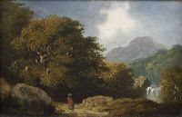 Wooded Mountain Landscape with Figure and Waterfall