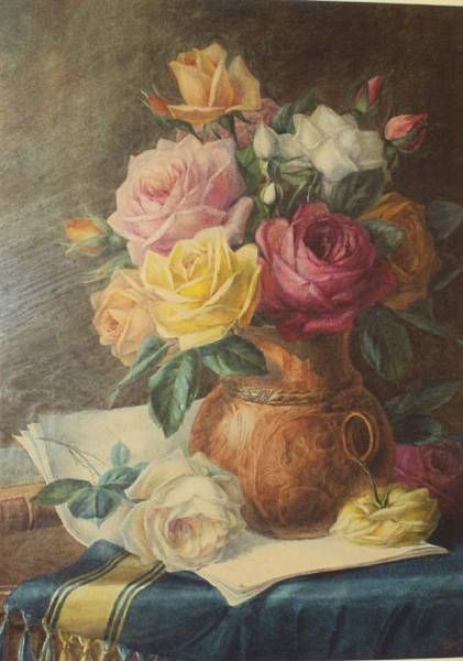 Still Life of roses and sheet music on a table top