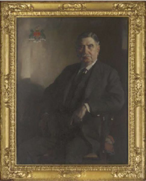 | Portrait of Sir William Hannay Raeburn, three-quarter-length, seated in a dark suit, a coat-of-arms to the top right corner | |
