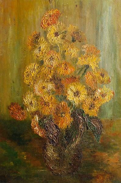 | Vase of marigolds handwritten label verso states 'To Alfred, thought you might like this picture by my father | |