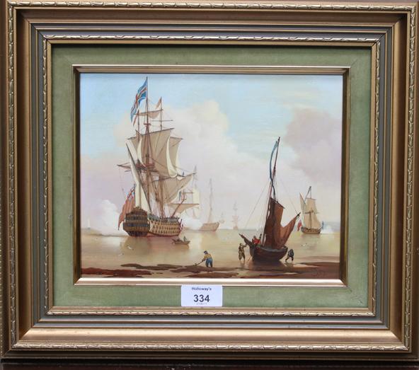Man o War and other ships on a calm sea, figures on the shore