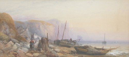 | Coastal scene with fishing boats, fisherman's cottage and figures - river landscape with boy fishing from a bridge | |