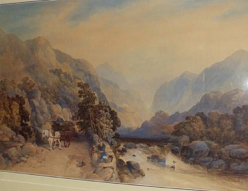 | Mountainous river landscape, with figures, horse and cart on a riverside track | |