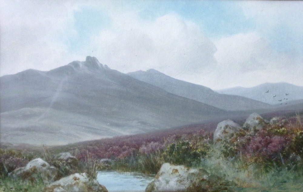 | One a view over a moorland stream, with mountains in the background, the other a rocky shoreline | |