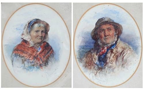 Portrait of a fisherman, and another of an old lady wearing a headscarf and shawl