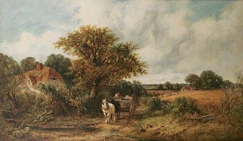 | A horsedrawn cart on a track beside a half timbered cottage amidst trees, harvesters at work in a cornfield nearby | |
