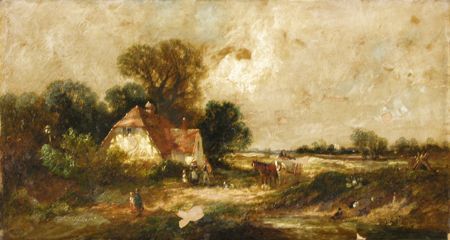 | A WOODED LANDSCAPE WITH FIGURES AND A HORSE DRAWN CART NEAR A COTTAGE | |