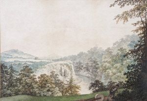 | A view of the river Boyne from the window of Beauparc, with a gardener, Carrickdexter and the Hill of Slane in the distance | |