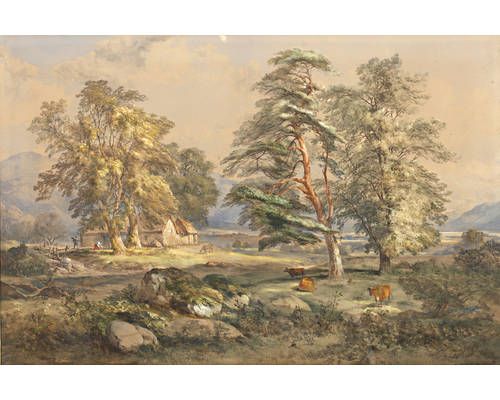| Highland landscape, with figures and cattle by a croft | |
