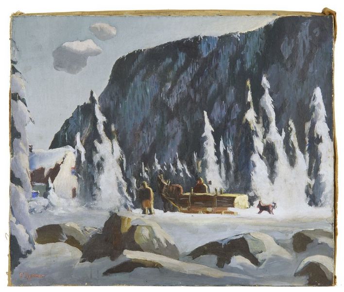 Winter mountain landscape with figures, horses, and sleigh