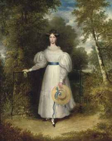 | Portrait of a lady, small full-length, in a white dress with a blue sash, holding a straw hat, standing by a gate, a landscape b | |