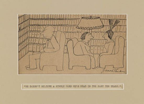 | He Doesn't Believe a Single Word He's Read in the Past Ten Years."Ink cartoon | |