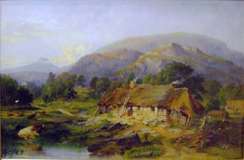 | Mountain view with stone thatched cottage and figure | |