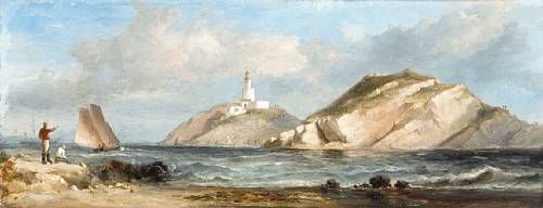 | A two-masted schooner passing an anchored merchantman off the Mumbles lighthouse, South Wales | |