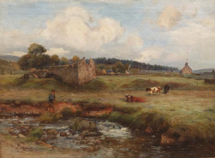 Angler by a river, believed to be Medwins Water, Lanarkshire