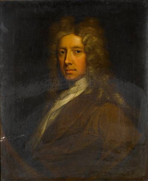 | Portrait of a gentleman of the Gore family half-length, in dark red costume and white lace jabot, within a painted oval | |