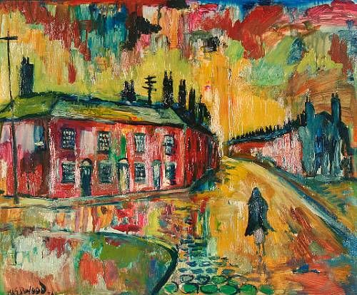 Woman in Shawl and Pink Rain, St. George Street, Wigan