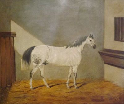 A grey dappled stallion in a stable