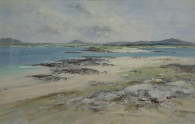| Mannin Bay - Connemara, beach scene with three figures walking on the sandy shore and yachts in the distant bay | |