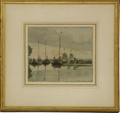 Barges on a canal with windmills