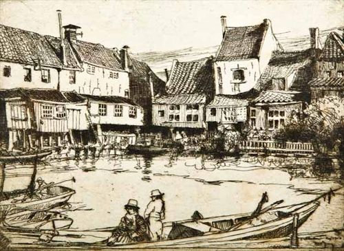 Dutch River Town Scene with Figures and Boats