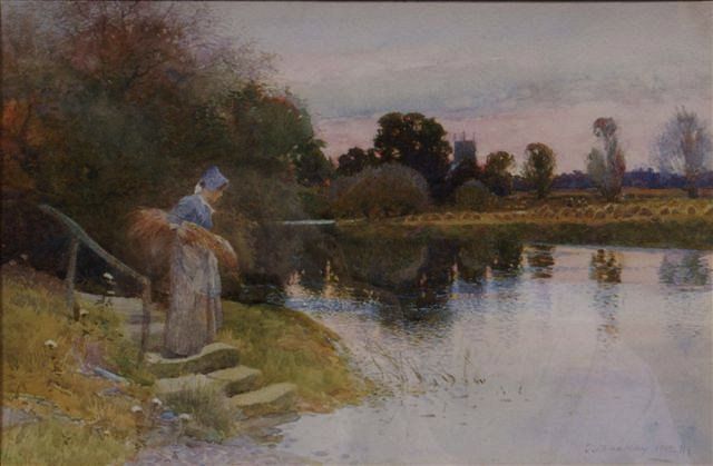 | A young lady holding a sheaf of corn beside a riverbank | |
