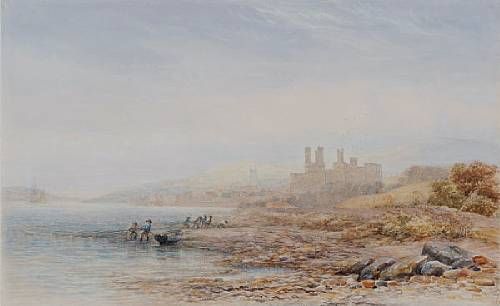 Caernarfon Castle, with figures hauling nets ashore to the foreground
