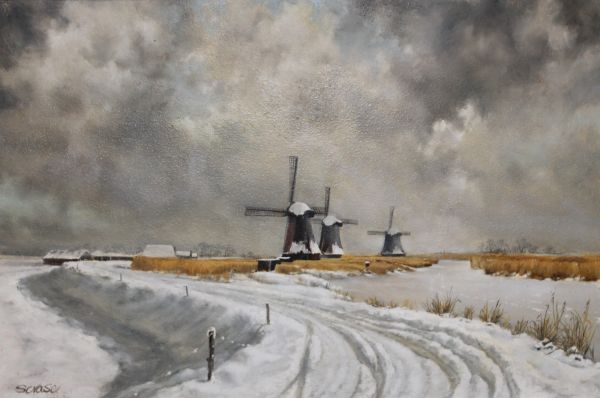 Winter scene with windmill