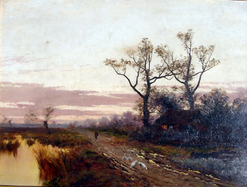 Figure and geese on a lane at sunset