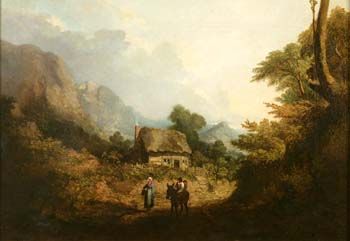 | Welsh Landscape with Travellers and Donkey in a Lane by a Thatched Cottage, Mountain Background | |