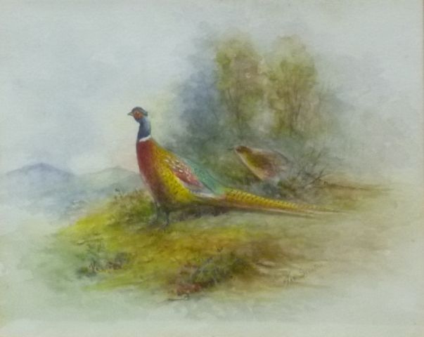 A cock and hen pheasant emerging from cover